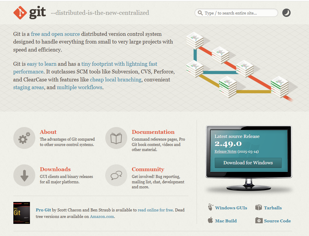 위의 사이트에 들어가서 먼저 git을 설치해야 한다. 사이트에 들어가보면 다음과 같은 화면이 나오는데, 윈도우의 경우 Download for Windows라는 것을 눌러서 본인의 컴퓨터에 git을 설치한다.