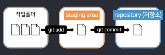 아래의 그림과 같이 기록할 파일을 고른 장소를 staging area라고 하며, 최종적으로 저장되는 저장소를 repository(리포지토리)라고 한다.