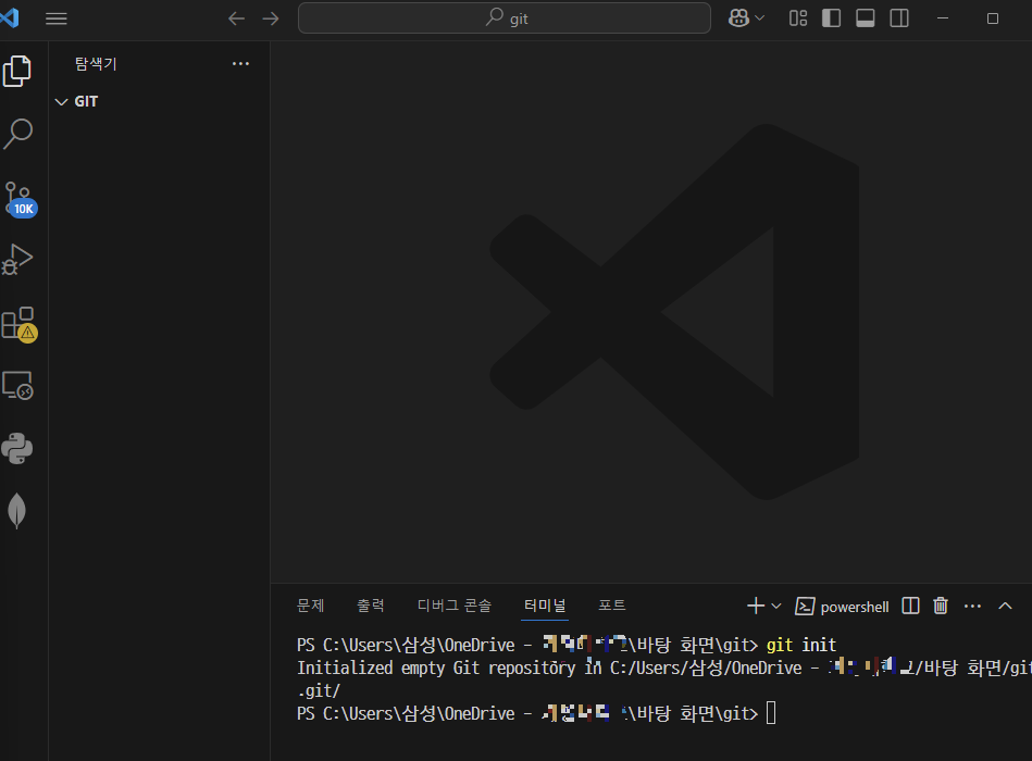 새 터미널에서 "git init"을 치면 다음과 같이 git이라는 소프트웨어가 본인의 작업환경을 실시간으로 확인할 수 있게끔 설정이 된다.